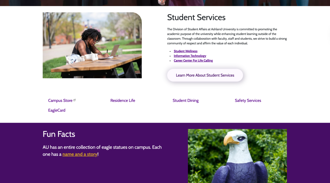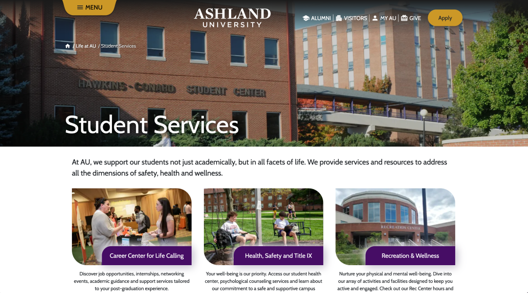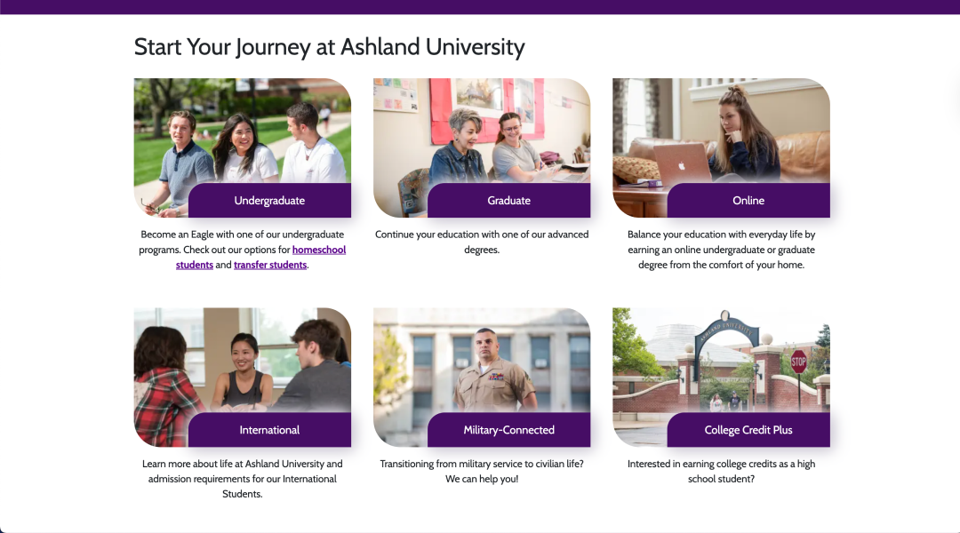 Ashland’s website design hadn’t been updated in several years. Siloed content and an unclear information architecture made it difficult for visitors to find the information they needed. The overall experience was also not reflective of the value the university places on its students.