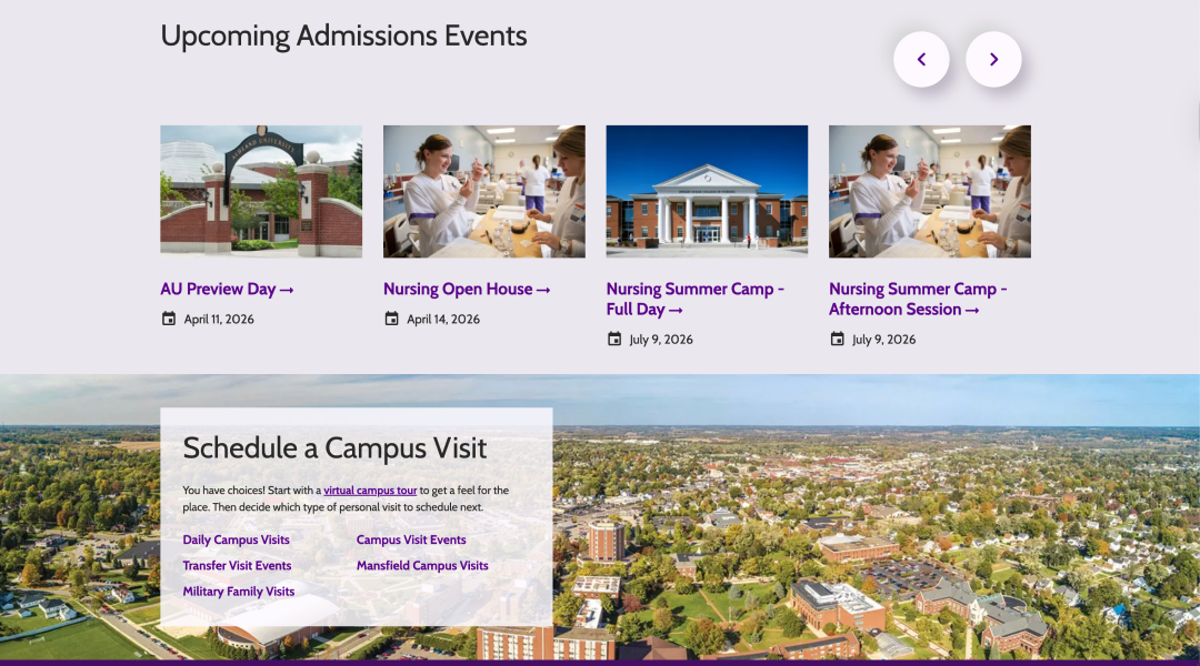 The website needed a total transformation. This meant a migration from Drupal 7 to Drupal 9, an updated content strategy, and a complete visual redesign. As one of its primary marketing tools, Ashland wanted a digital property that reflected the true student experience in order to increase enrollment inquiries, applications, and acceptance of enrollment commitments.